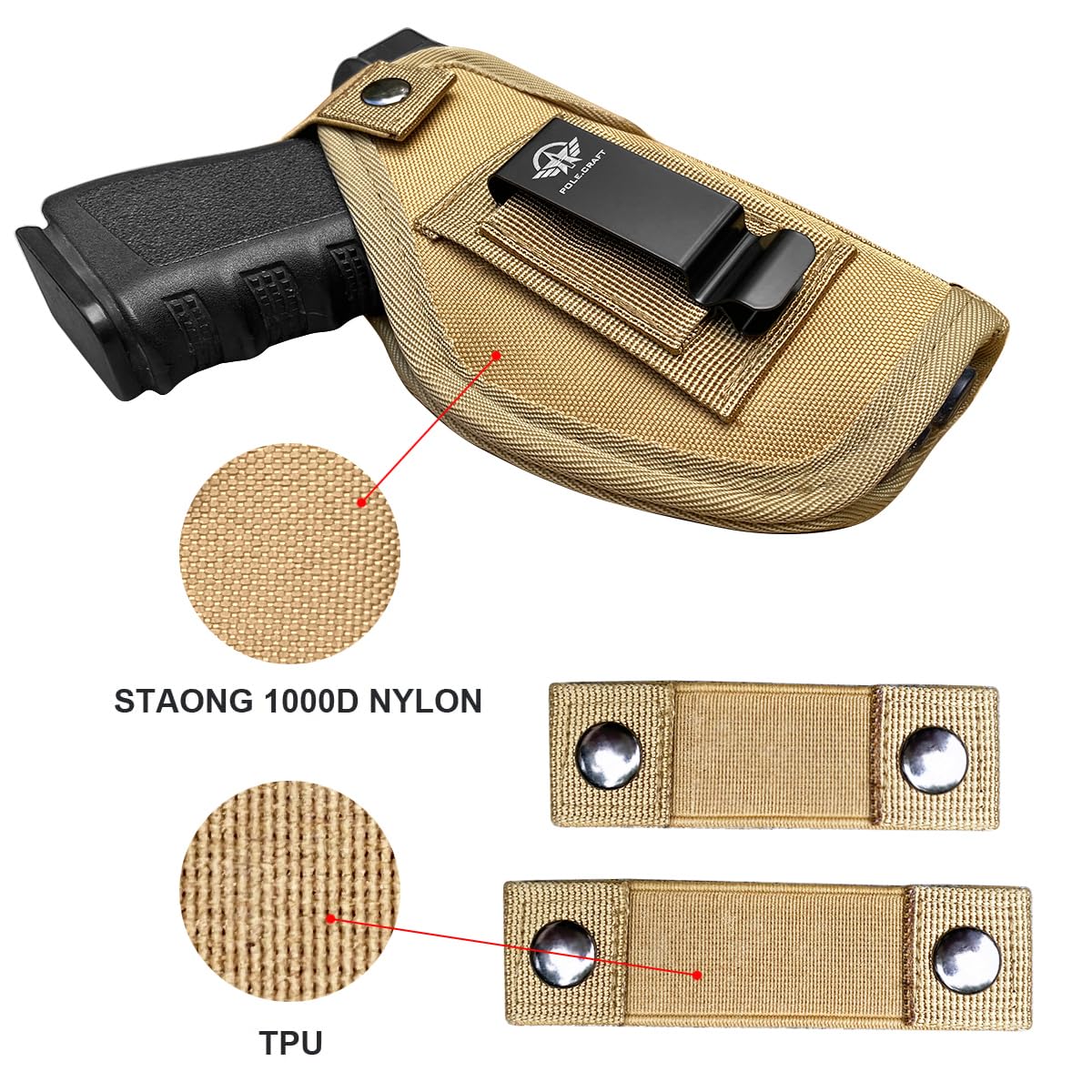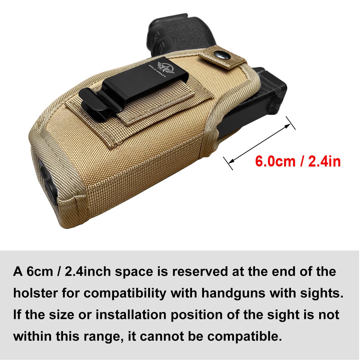 NYLON HANDCRAFT: Made of durable and sturdy 1000D nylon. Our 9mm holster for men features a resistant Zn-Fe plated button, and TPU elastic cord. 2.3" metal clip features place on outside or inside waistband that you can adjust according to your preference, fit upto 2 inch wide belt. Good wear and water resistance, which makes this tactical pistol holster perform better in the field.